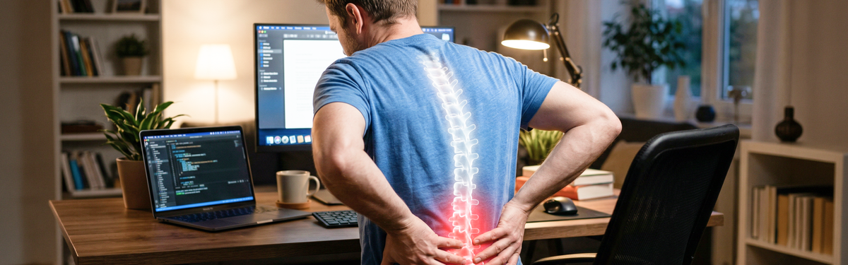 Мне 35 лет, из них около десяти лет посвятил разработке. Последние пять работаю удаленно. Кресло у меня дорогое, с ортопедической спинкой, но это не спасает, когда сидишь порой по многу часов и почти не встаешь. Завтрак за монитором, обед за монитором, ужин с ноутбуком на коленях.